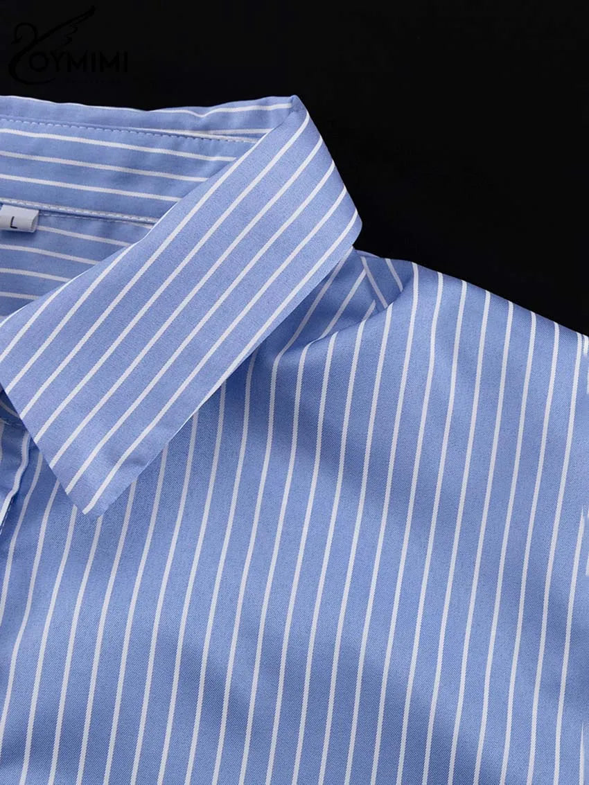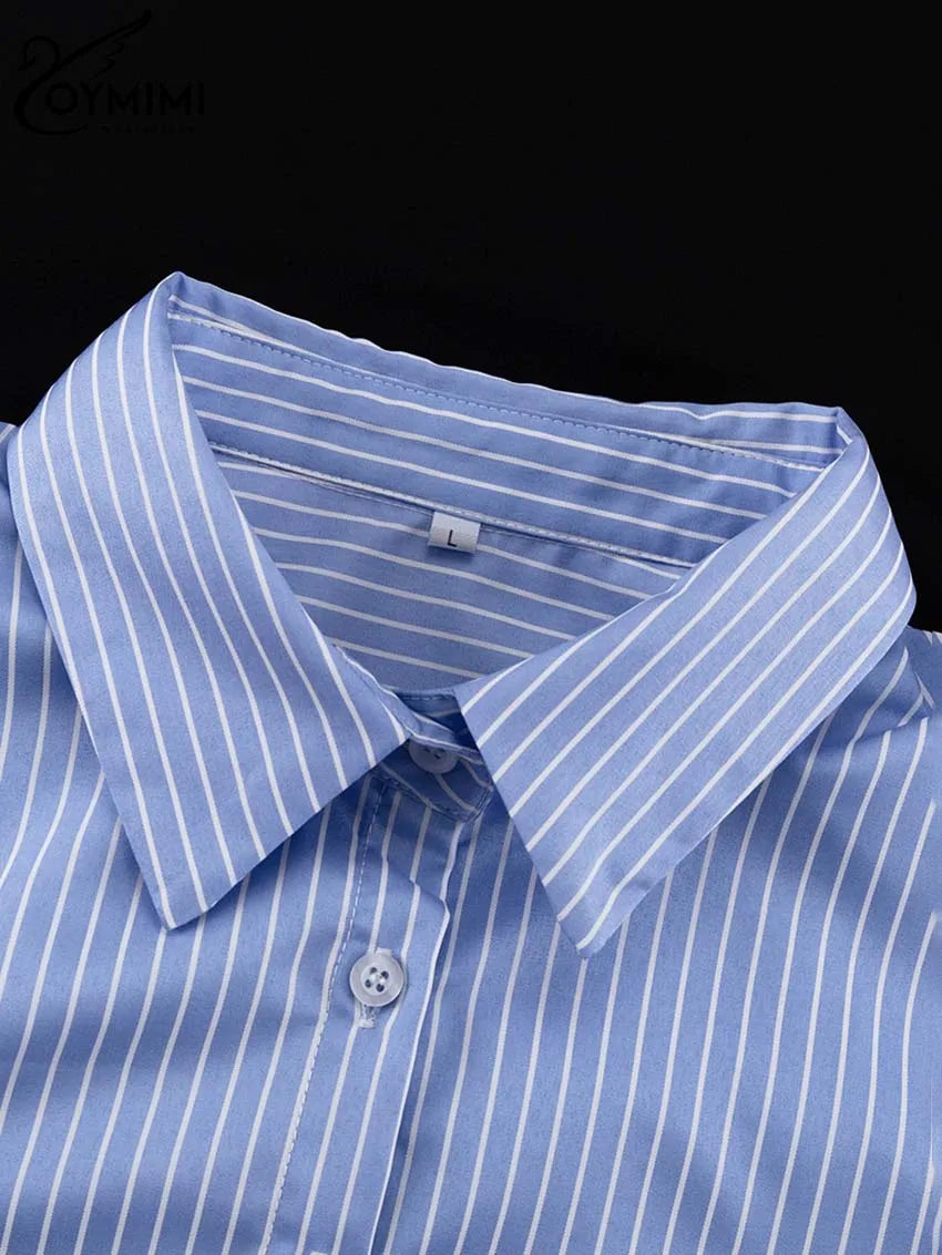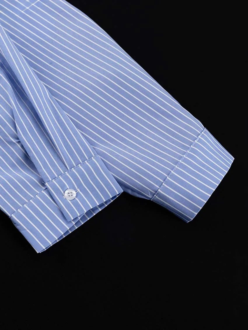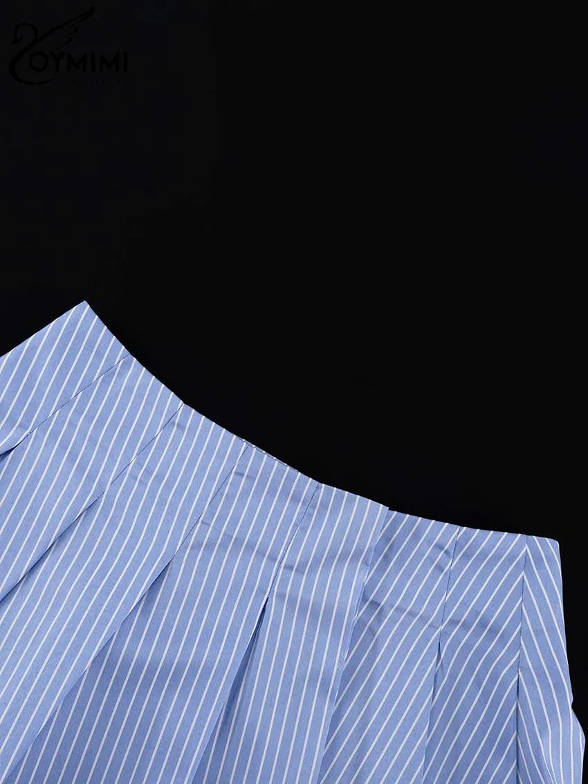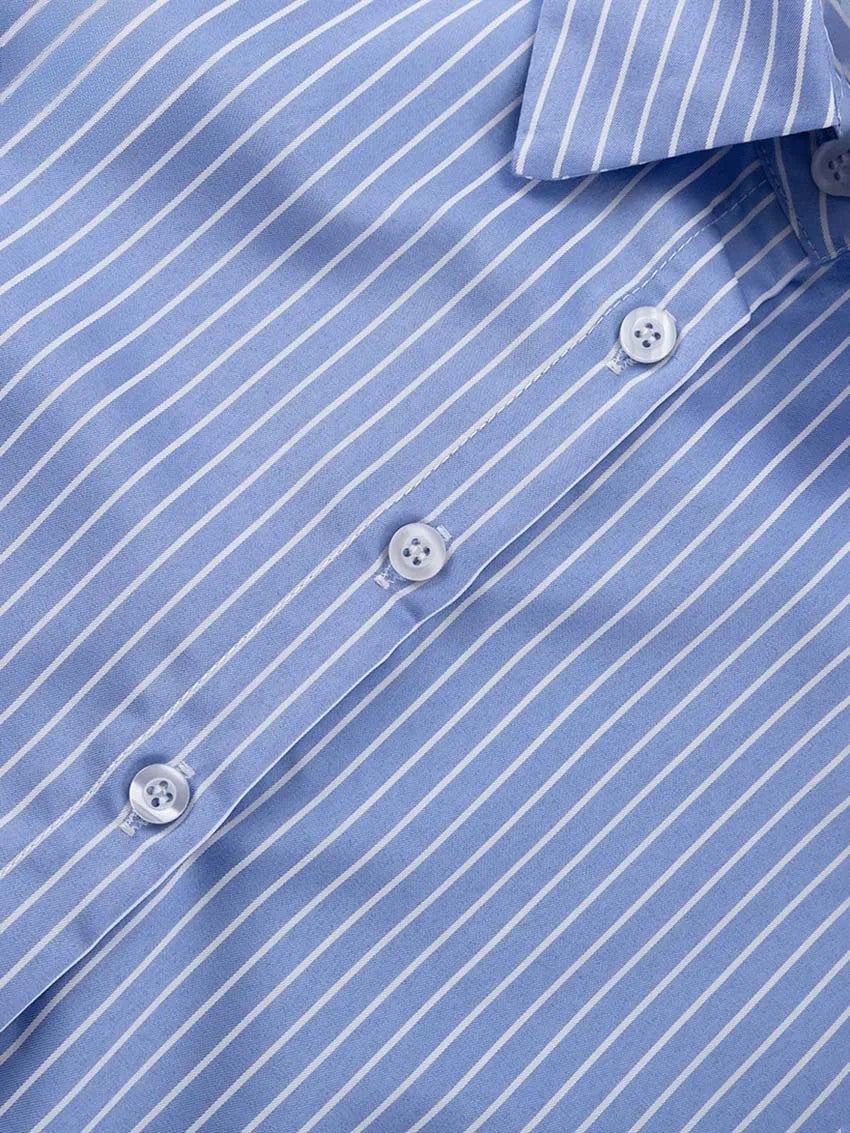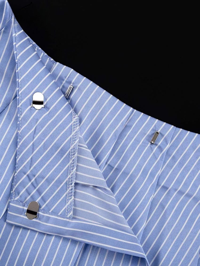 As listras verticais azuis alongam e valorizam a silhueta, enquanto o top cropped estruturado com botões elegantes acrescenta detalhes refinados. A saia plissada combinando traz movimento e feminilidade — perfeitamente equilibrada para qualquer ocasião.