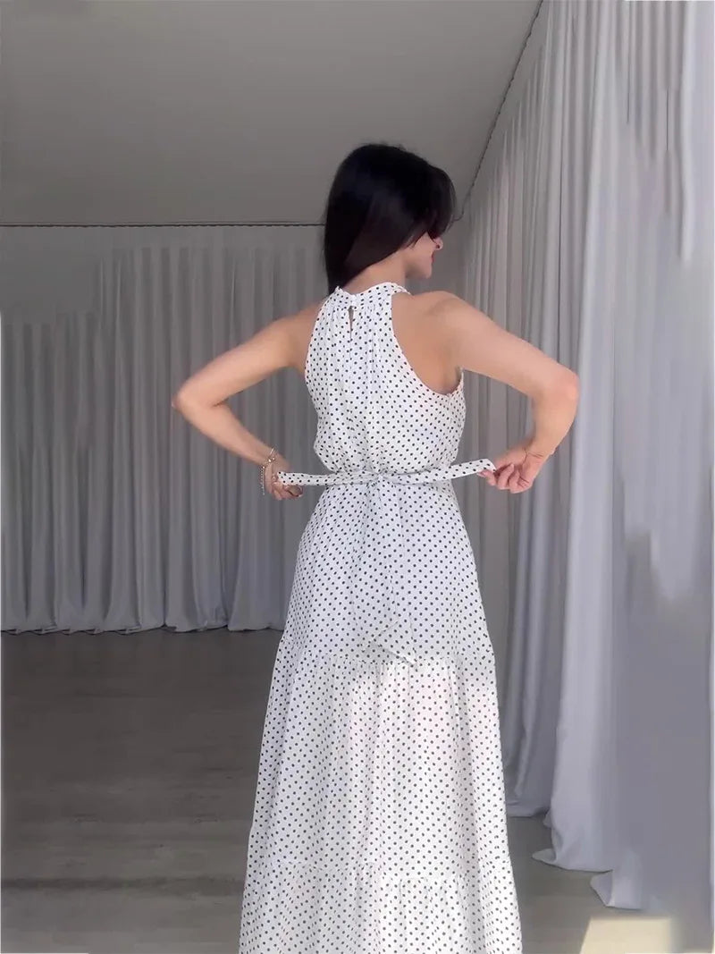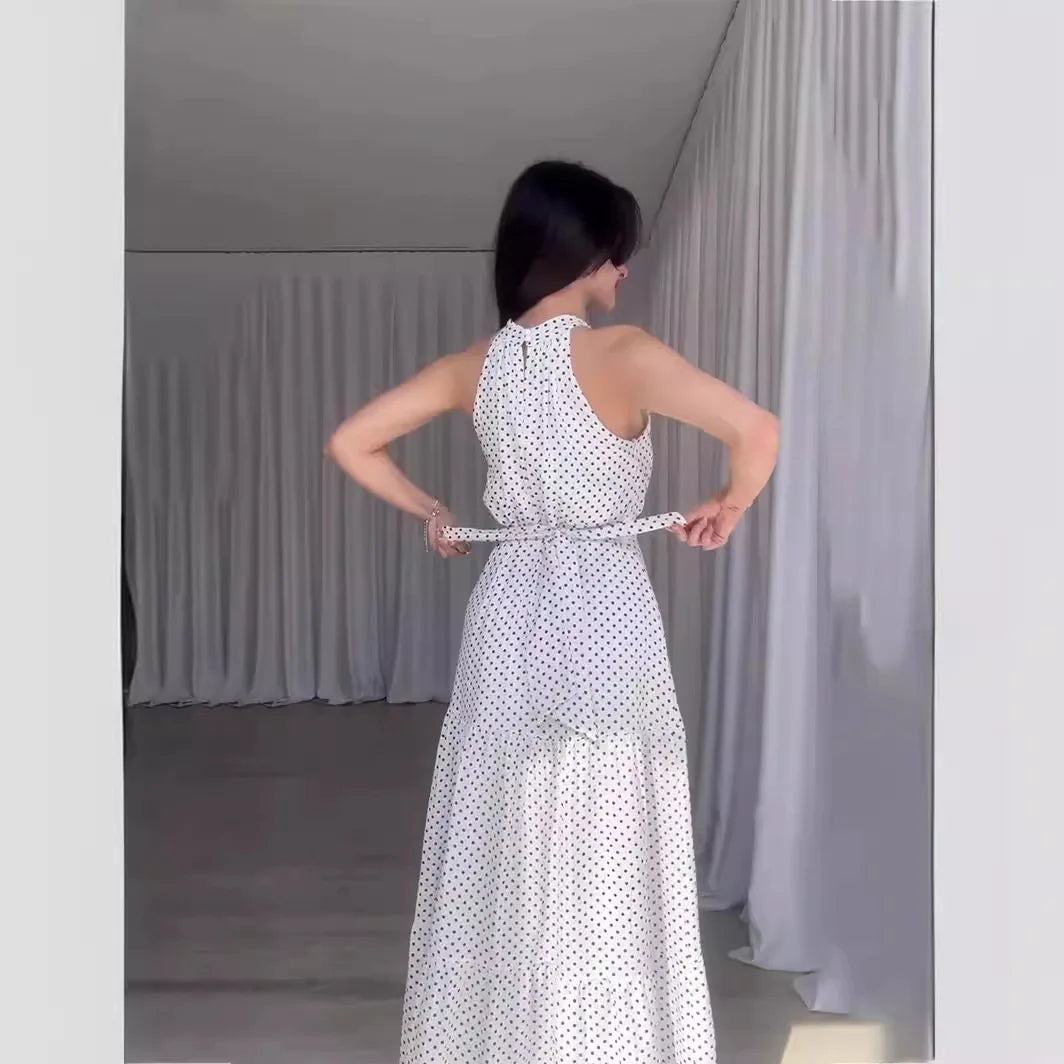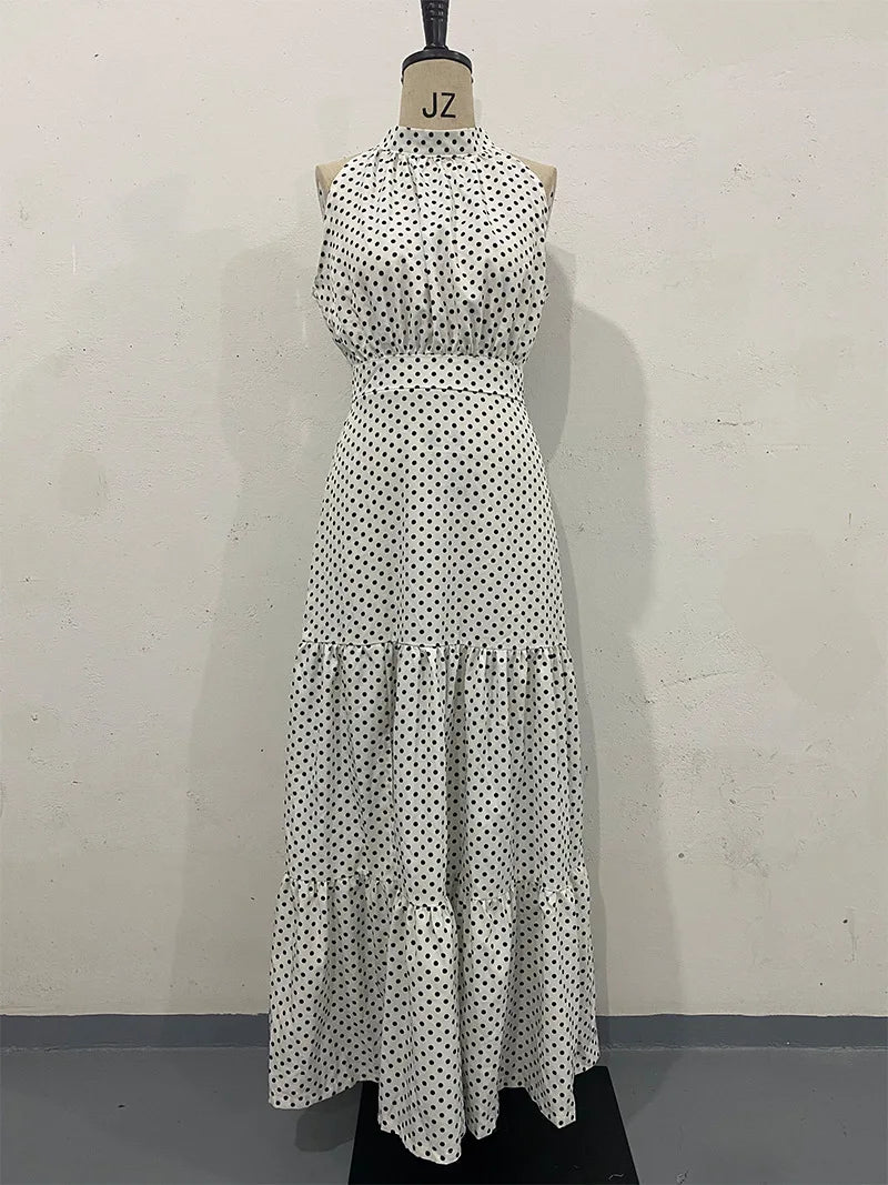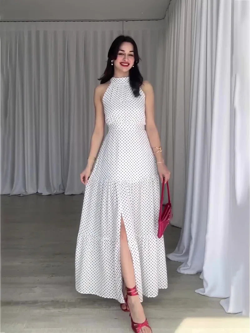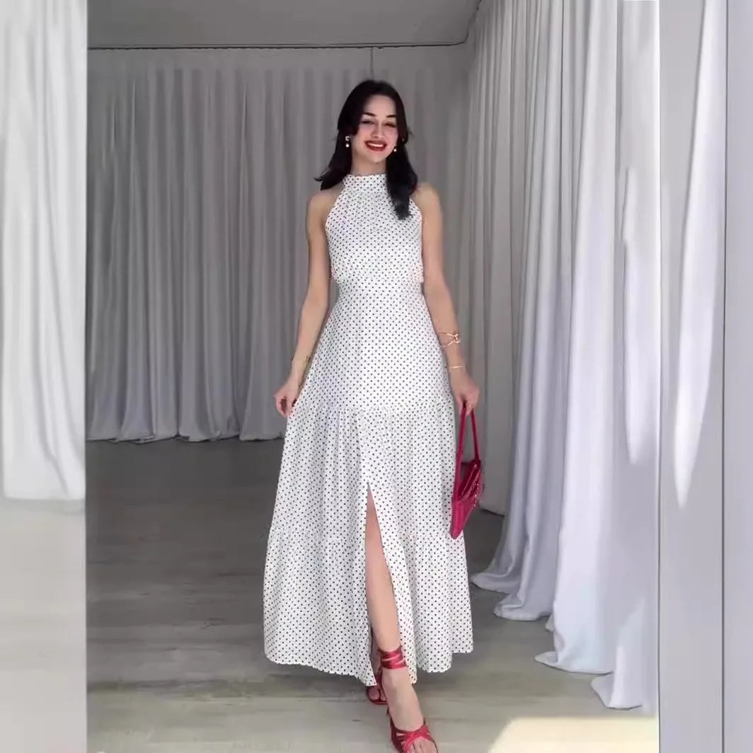 The Halter Neck Maxi Dress with Side Slit is the perfect blend of classic elegance and modern allure. Designed with a flattering halter neckline, a flowing maxi length and a chic side slit, this polka dot dress offers a feminine silhouette that is both versatile and timeless.