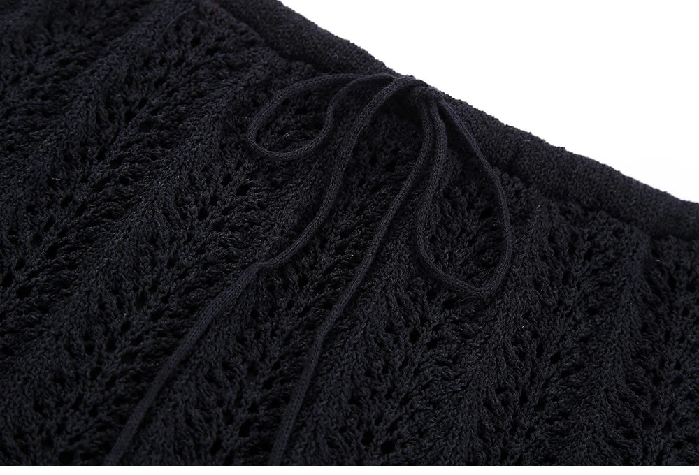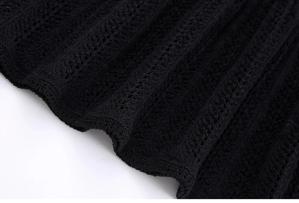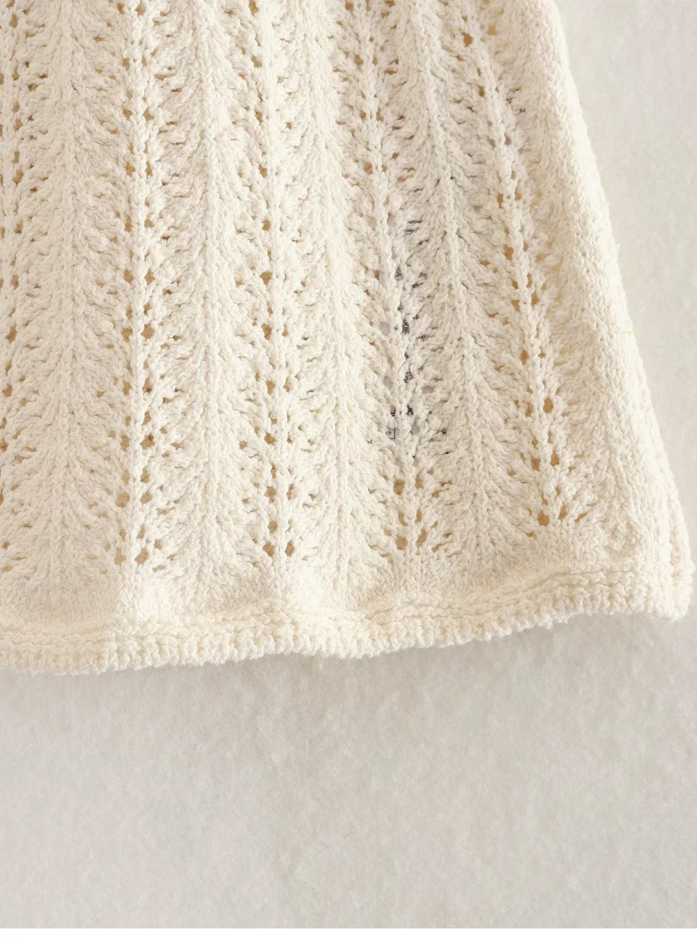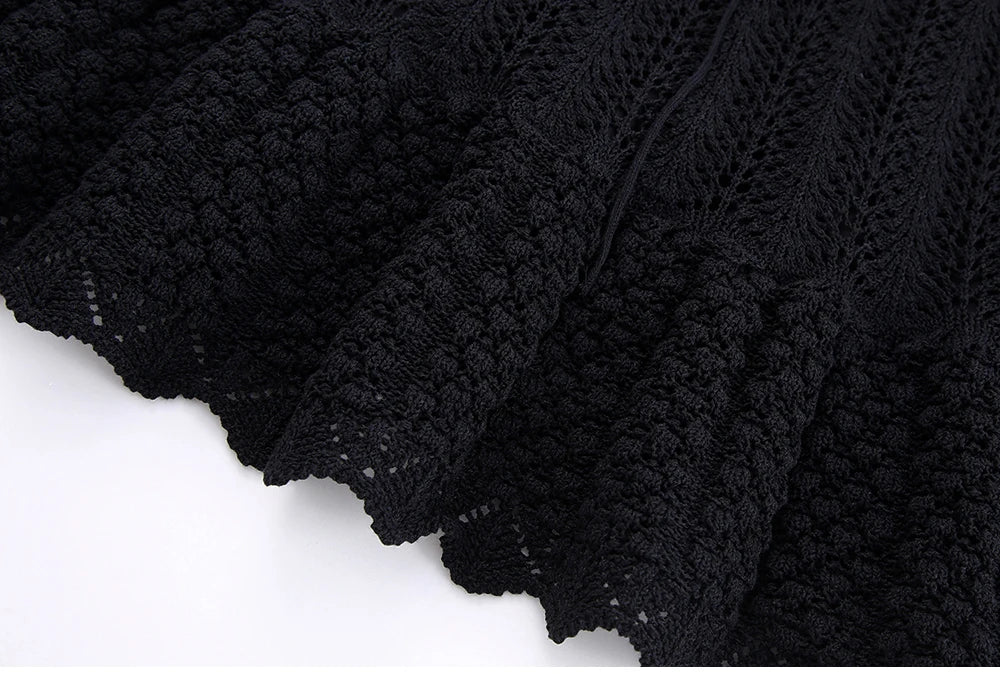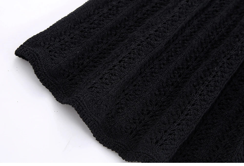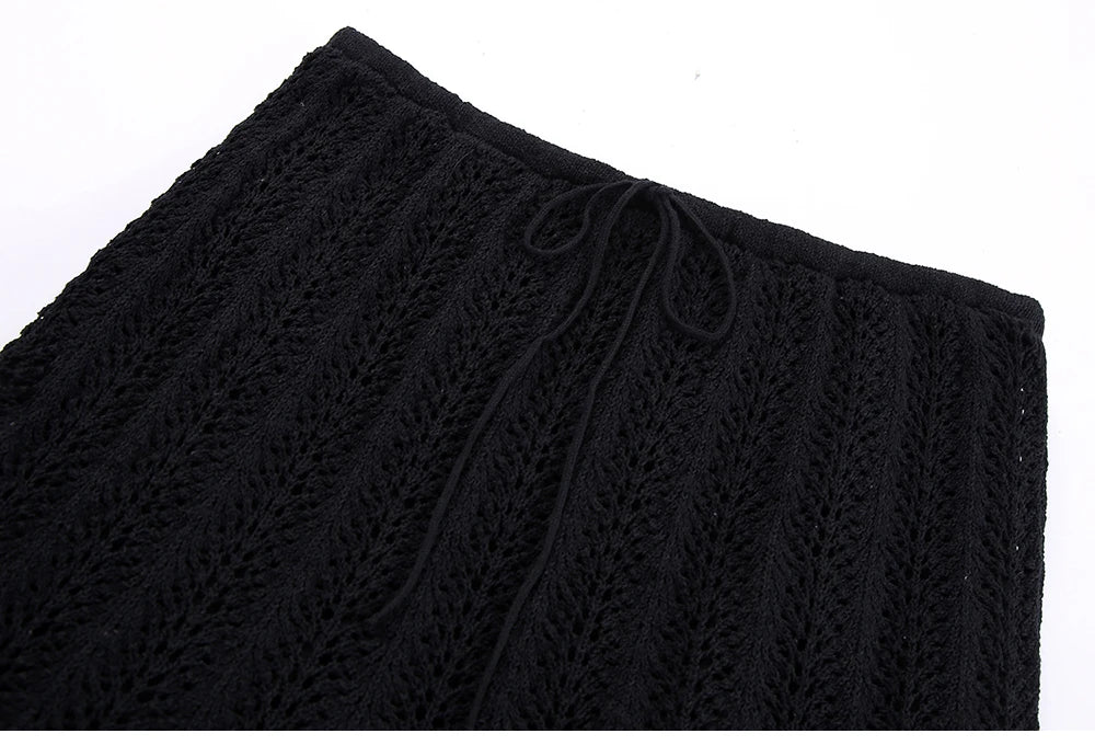 The sleeveless top showcases delicate hollow-knit patterns that add subtle texture and allure, while the A-line skirt flows gently with every step. The drawstring waist ensures a flattering, adjustable fit that enhances your silhouette with refined charm.
