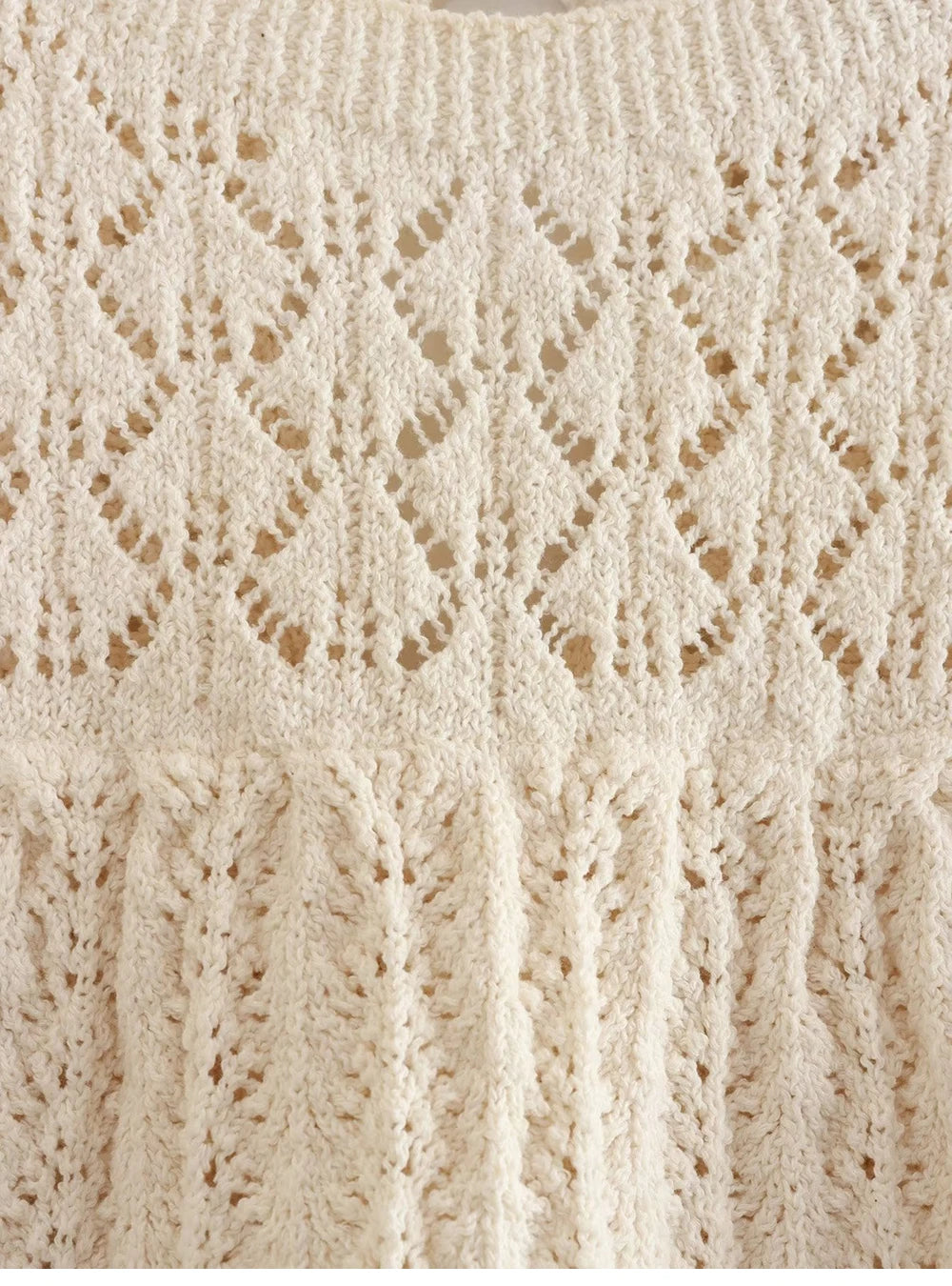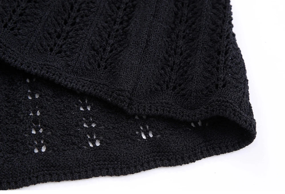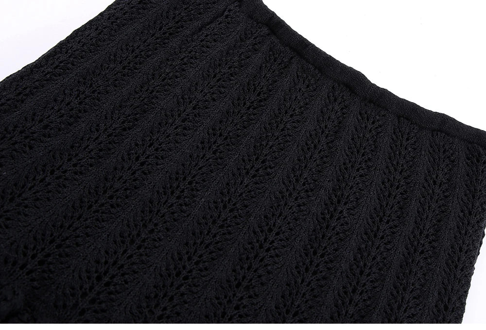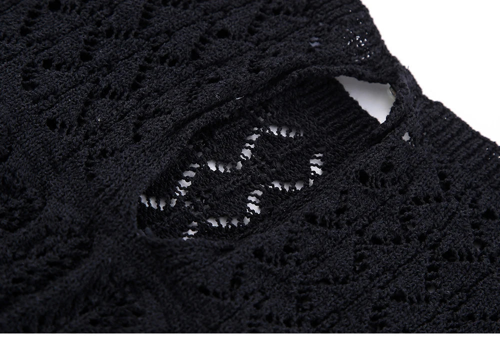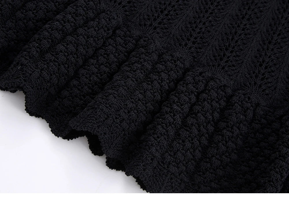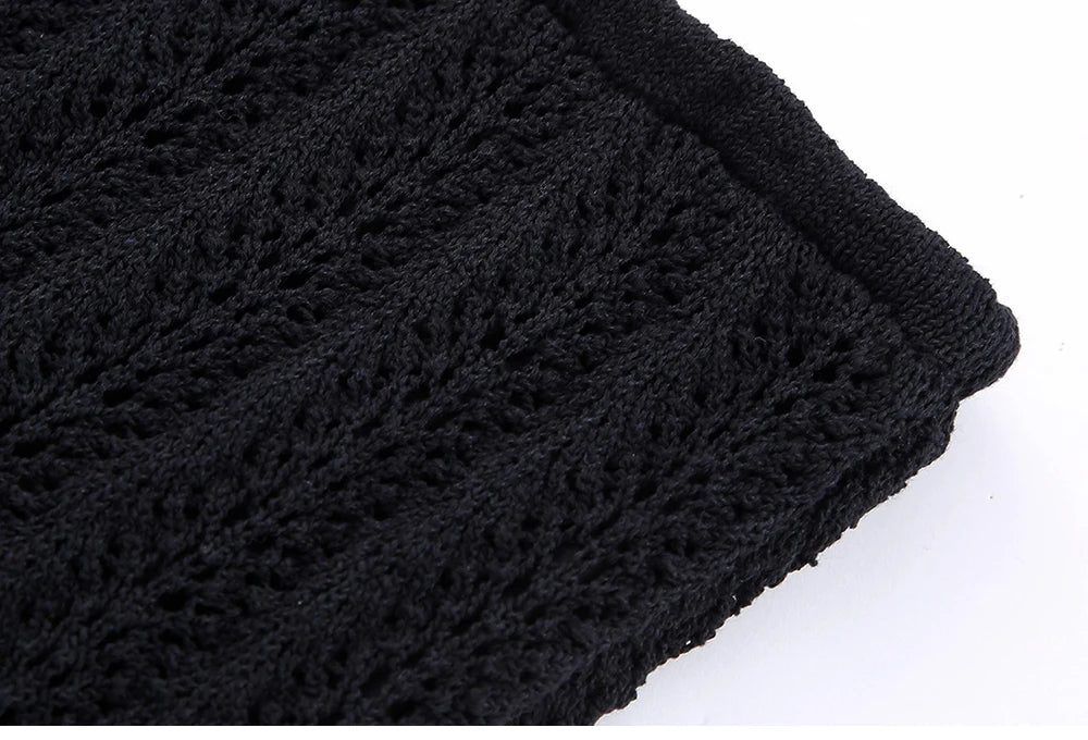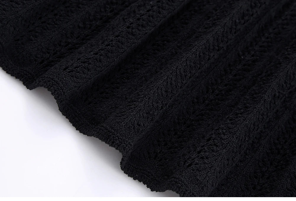 The sleeveless top showcases delicate hollow-knit patterns that add subtle texture and allure, while the A-line skirt flows gently with every step. The drawstring waist ensures a flattering, adjustable fit that enhances your silhouette with refined charm.