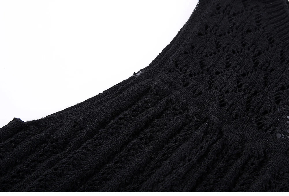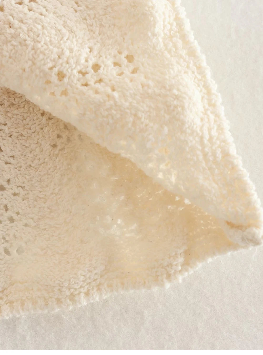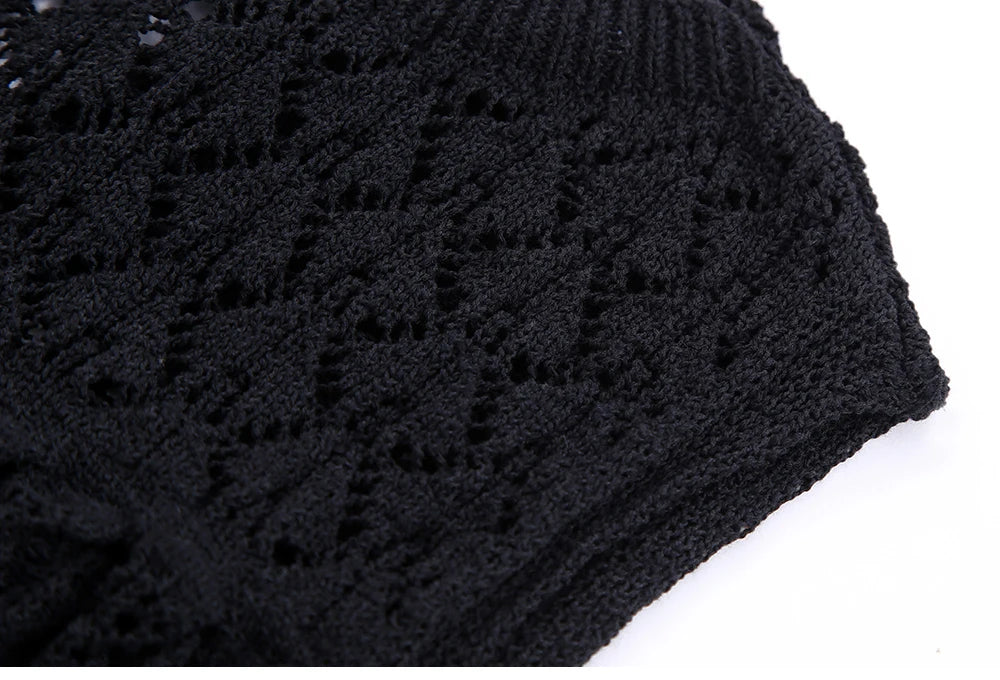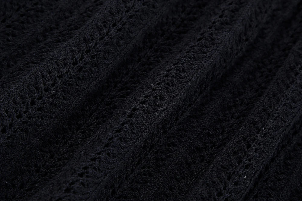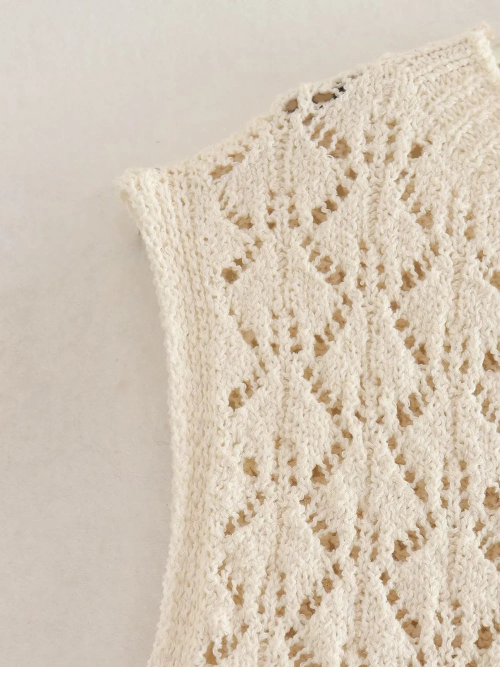 The sleeveless top showcases delicate hollow-knit patterns that add subtle texture and allure, while the A-line skirt flows gently with every step. The drawstring waist ensures a flattering, adjustable fit that enhances your silhouette with refined charm.