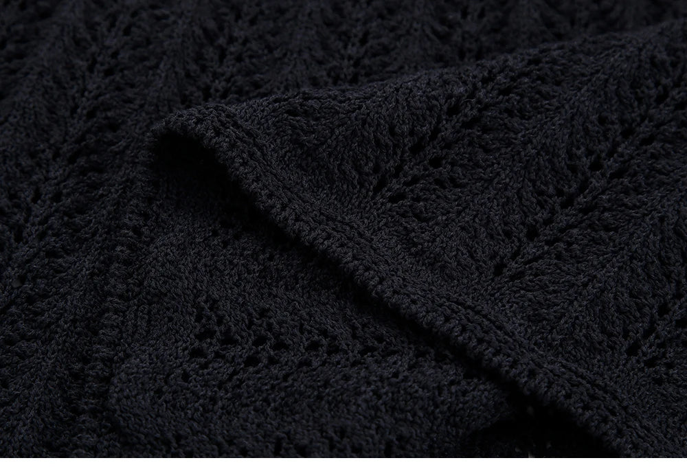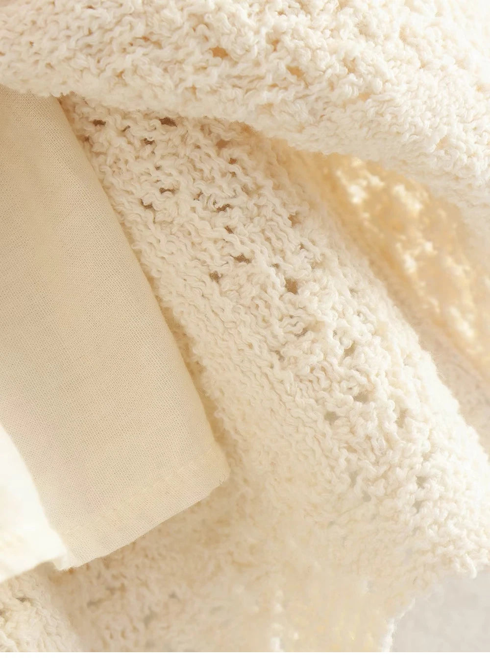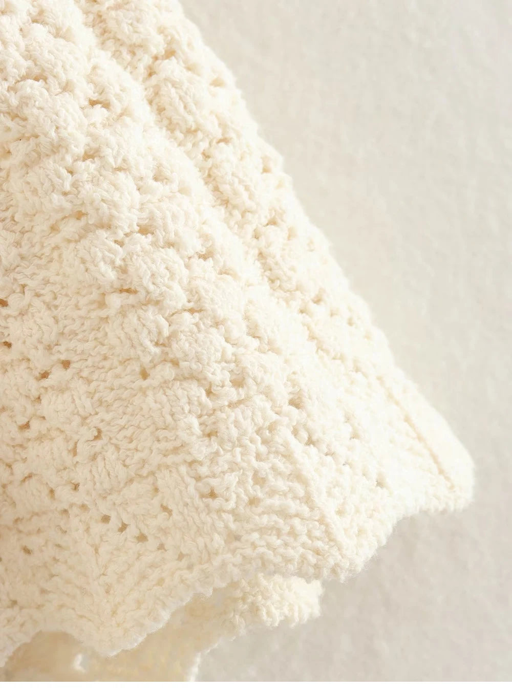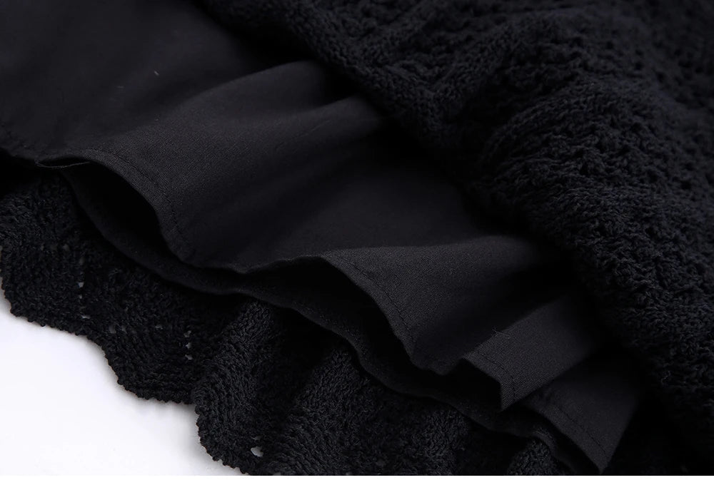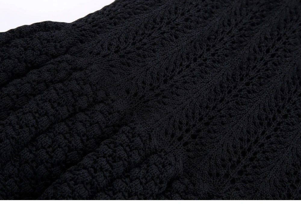 The sleeveless top showcases delicate hollow-knit patterns that add subtle texture and allure, while the A-line skirt flows gently with every step. The drawstring waist ensures a flattering, adjustable fit that enhances your silhouette with refined charm.